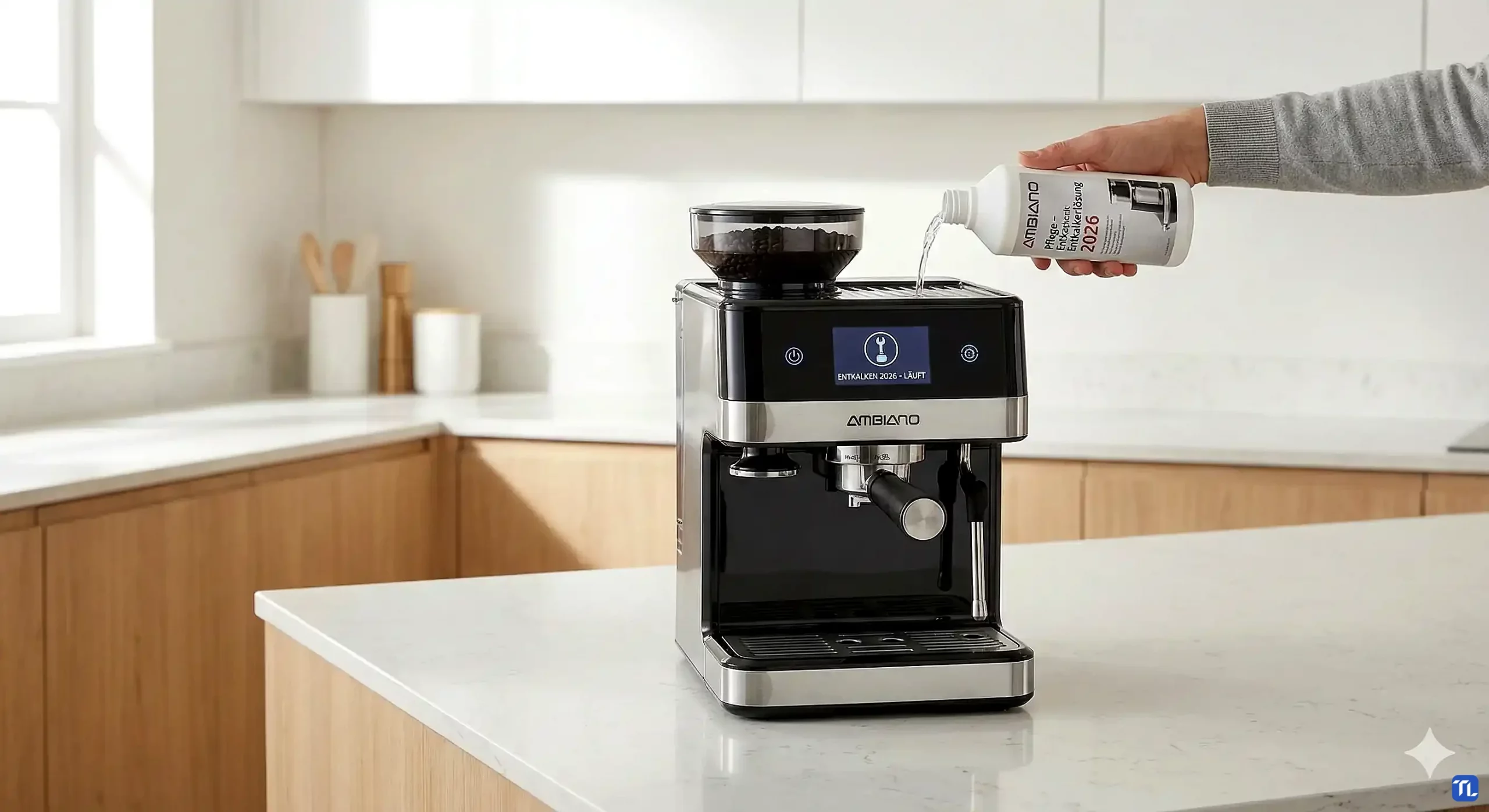 Leere den Wassertank und entferne den Wasserfilter, falls vorhanden. Mische 500 ml Wasser mit einem flüssigen Entkalker auf Zitronensäure-Basis. Vermeide Essig, da dieser die Dichtungen der Ambiano-Maschinen 2026 angreifen kann.