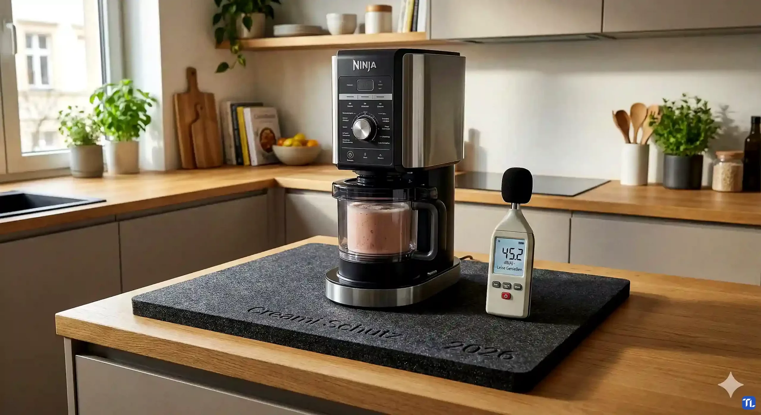 Lege ein schweres Holzbrett auf deine Arbeitsplatte und platziere darunter eine Gummimatte. Stelle die Ninja Creami auf das Brett. Die Masse des Bretts schluckt die hochfrequenten Vibrationen, während der Gummi den Tiefton-Schall isoliert. Das ist die effizienteste Methode unter 20 Euro.