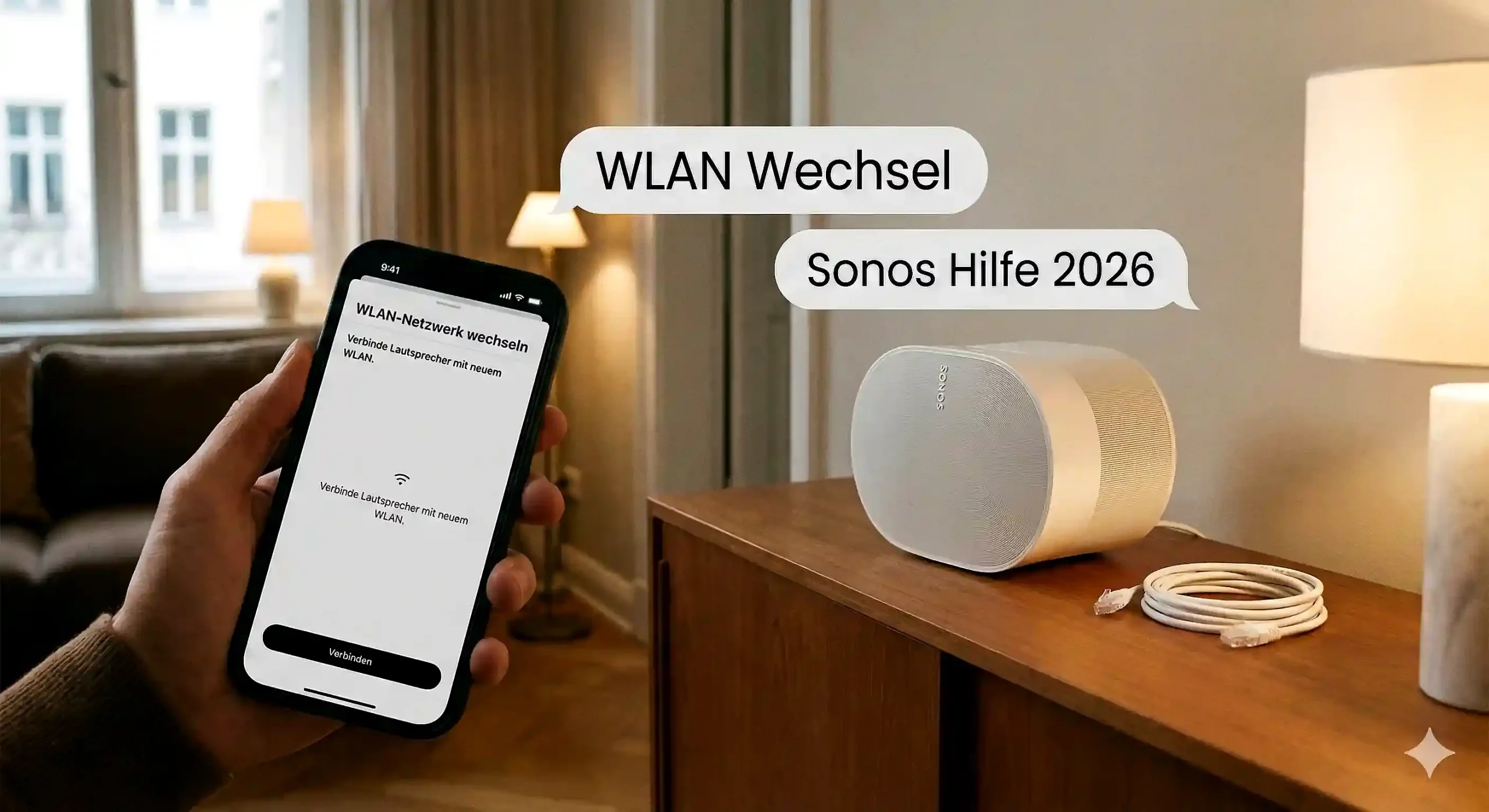 Verbinde einen deiner Sonos-Speaker per LAN-Kabel direkt mit dem Router. Warte zwei Minuten. Dein gesamtes System sollte nun in der App erscheinen. Gehe nun auf Einstellungen > System > Netzwerk > Netzwerk-Update. Sobald die WLAN-Daten übertragen wurden, kannst du das Kabel wieder entfernen.