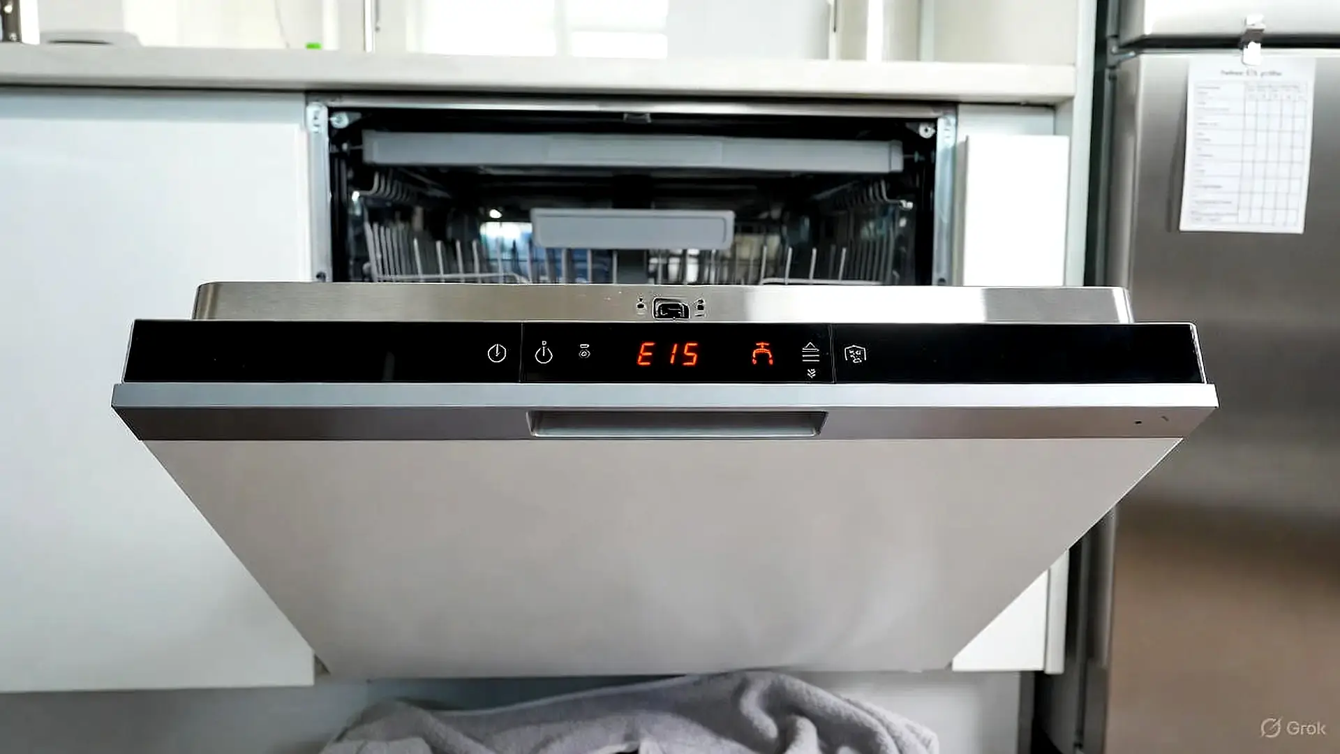 Wenn die Pumpe deiner Spülmaschine ununterbrochen läuft, obwohl das Programm beendet ist, und im Display E15 blinkt, steht Wasser in der Bodenwanne (nicht im Spülraum, sondern darunter). Das Gerät pumpt aus Sicherheitsgründen dauerhaft ab, um einen Wasserschaden in deiner Küche zu verhindern.